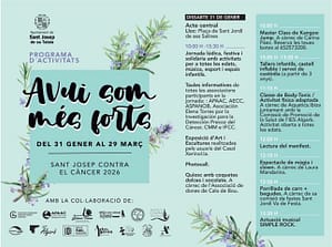 El municipio de Sant Josep de sa Talaia celebra entre el 31 de enero y el 29 de marzo de 2026 una nueva edición de Sant Josep contra el Càncer, una iniciativa solidaria que reúne actividades culturales, deportivas y divulgativas con el objetivo de visibilizar la enfermedad, apoyar a pacientes y familiares y promover la prevención. El programa se articula este año bajo el lema Avui som més forts, una consigna que subraya la importancia del acompañamiento y la cohesión social.