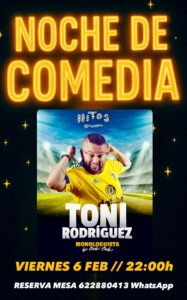 ​Originario de Cádiz, Toni Rodríguez es uno de los cómicos más queridos del panorama nacional. Se dio a conocer masivamente en programas como Central de Cómicos y El Rey de la Comedia. Su personaje, siempre ataviado con la camiseta del equipo de su ciudad, destaca por un humor costumbrista, blanco y directo. Es un experto en reírse de sí mismo y de las situaciones cotidianas, convirtiendo la sencillez en arte sobre el escenario.